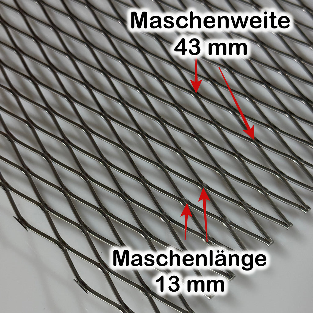 • Streckgitter MW 43 x 13 x 2 x 1 = Rhombusmaschen, Maschenweite 43mm (Länge) x 13mm (Breite); 2mm Steg, t=1,0mm